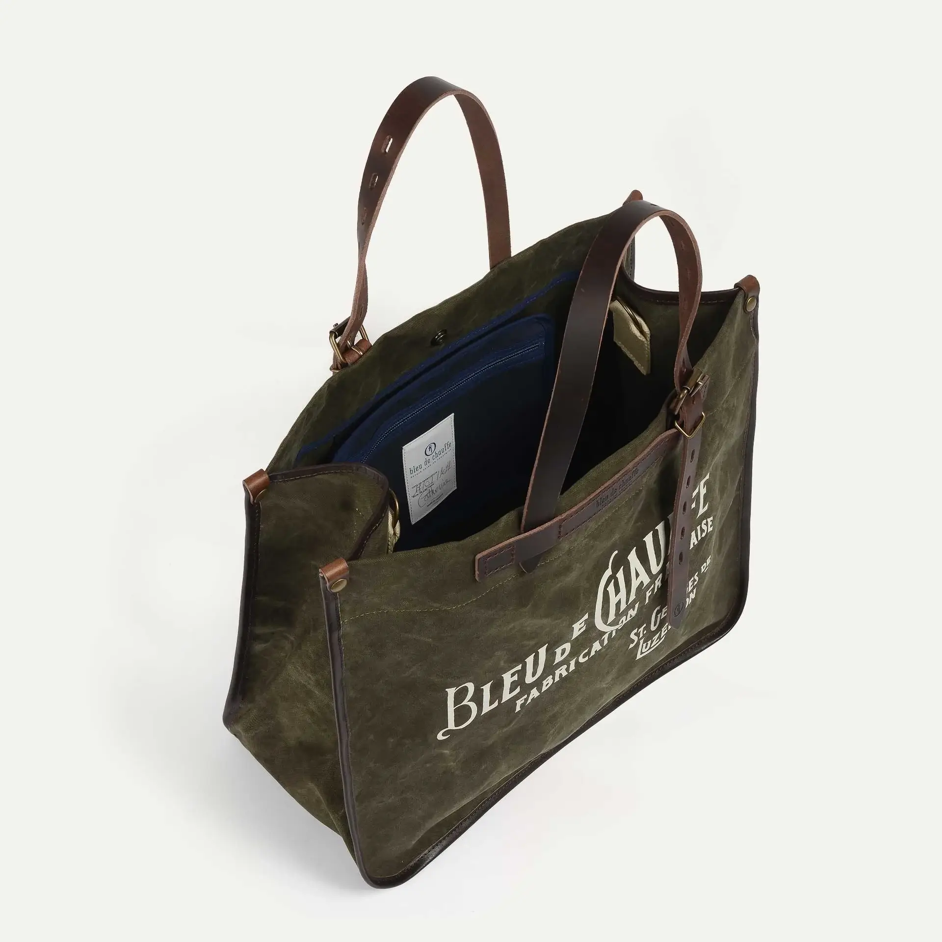 Le cabas Bazar est confectionné en toile « jeep », une superbe toile de coton fabriquée en Italie. Historiquement développée pour les collectionneurs de jeeps de la Seconde Guerre mondiale, cette matière emblématique a été redéveloppée en exclusivité pour Bleu de Chauffe.