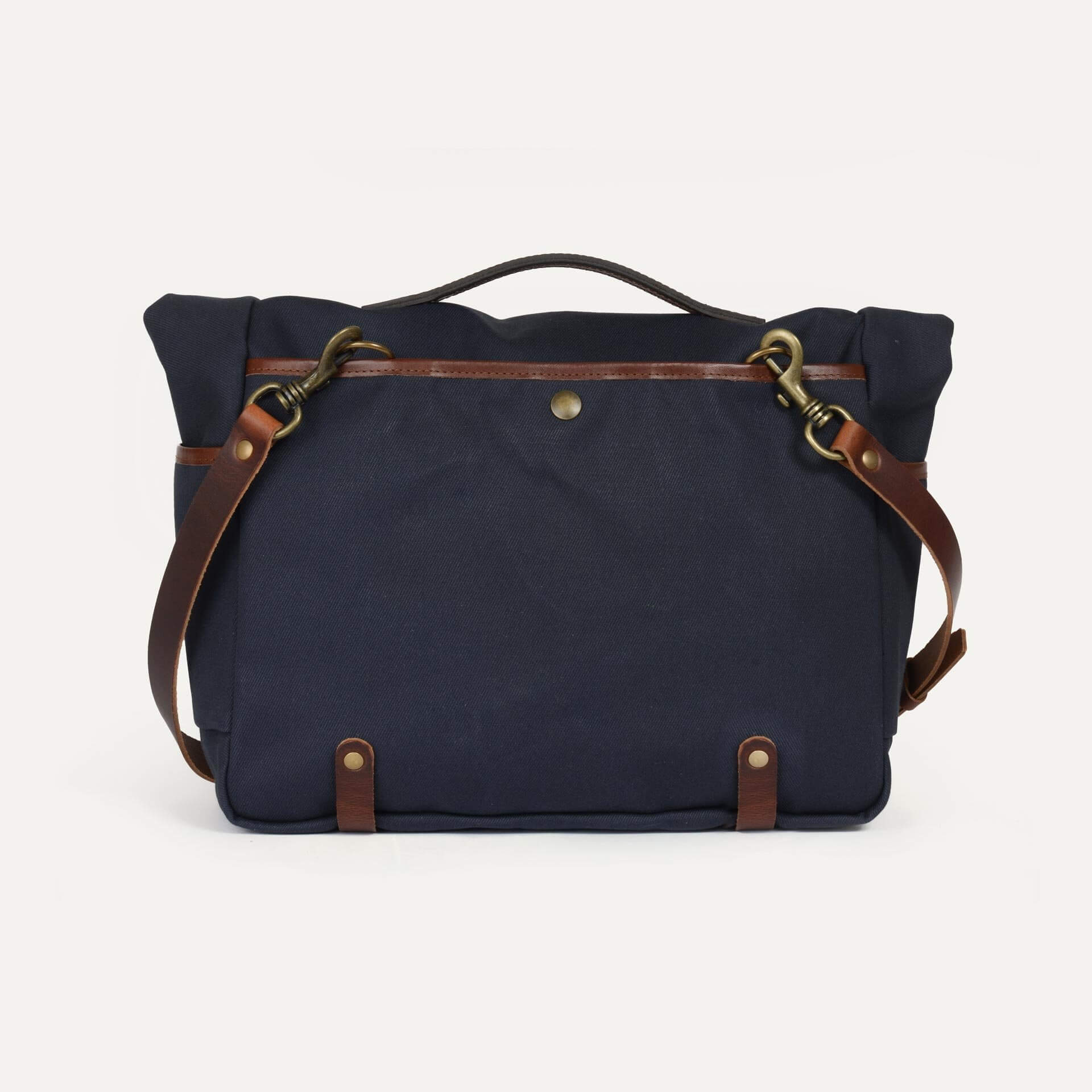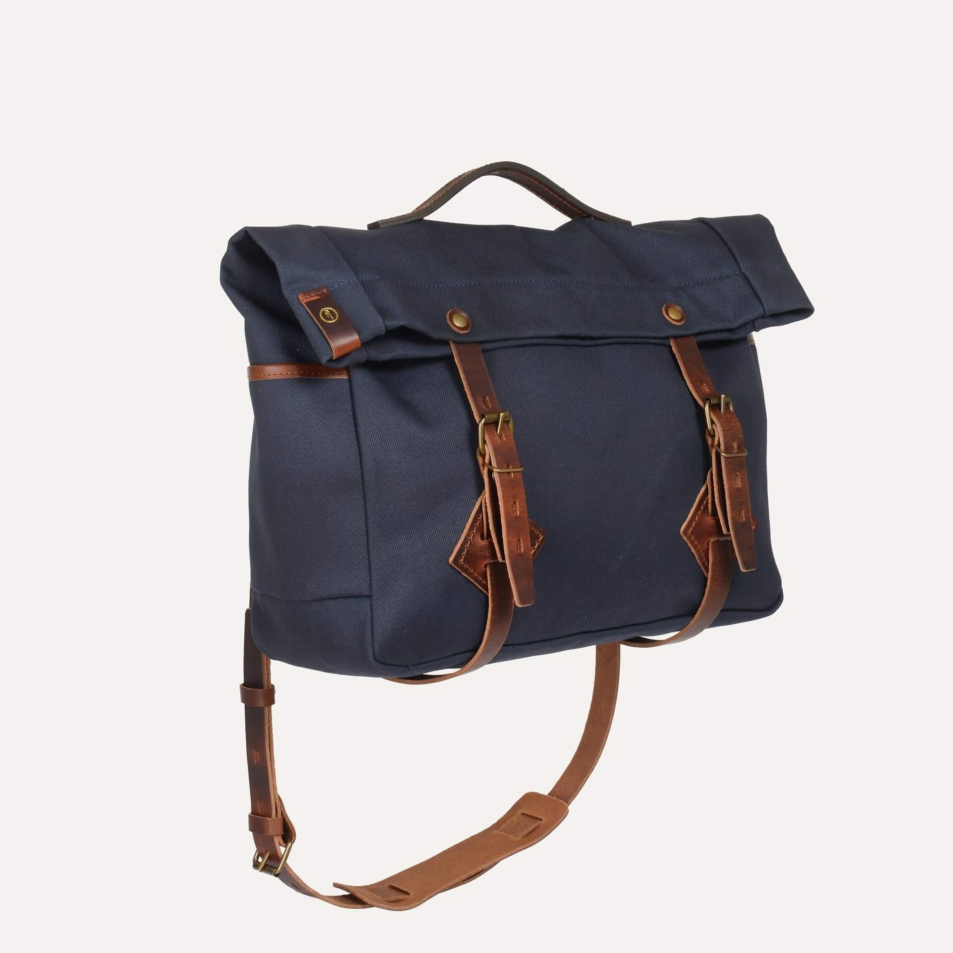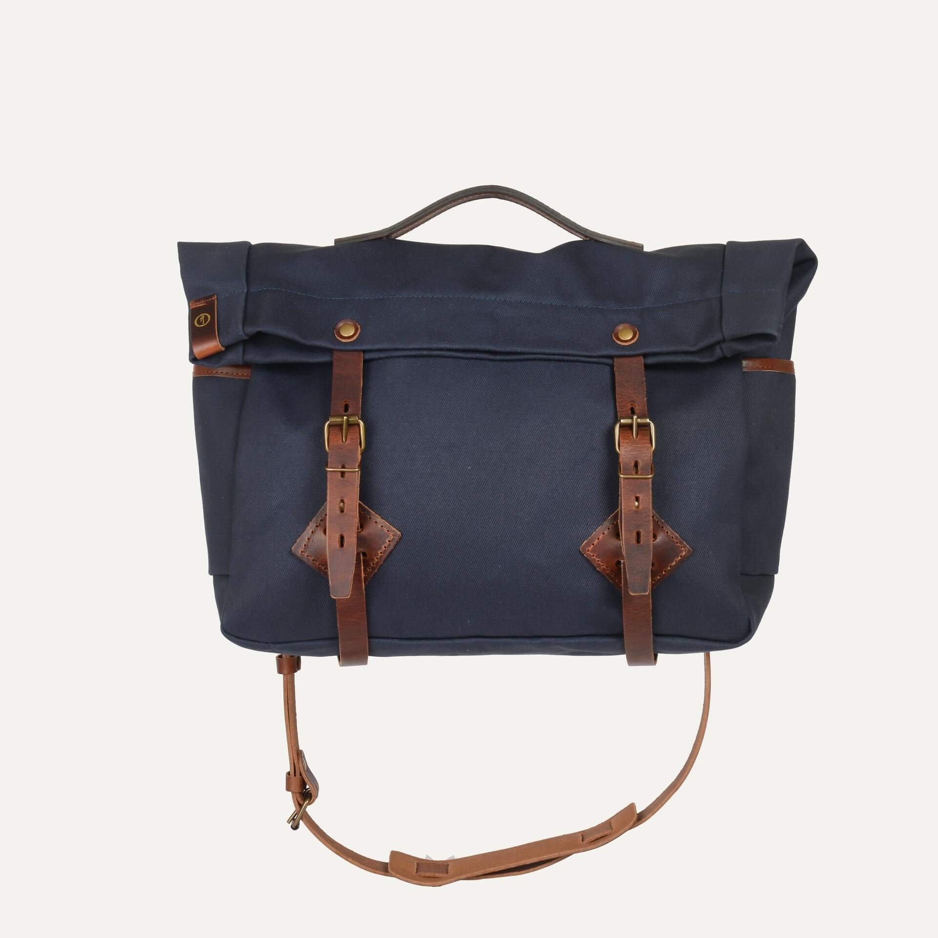 Sac musette en toile coton et cuir tanné végétal. Format paysage grande taille pour ordinateur jusqu’à 15 pouces. Bandoulière cuir réglable, trois poches extérieures accessibles et pratiques.